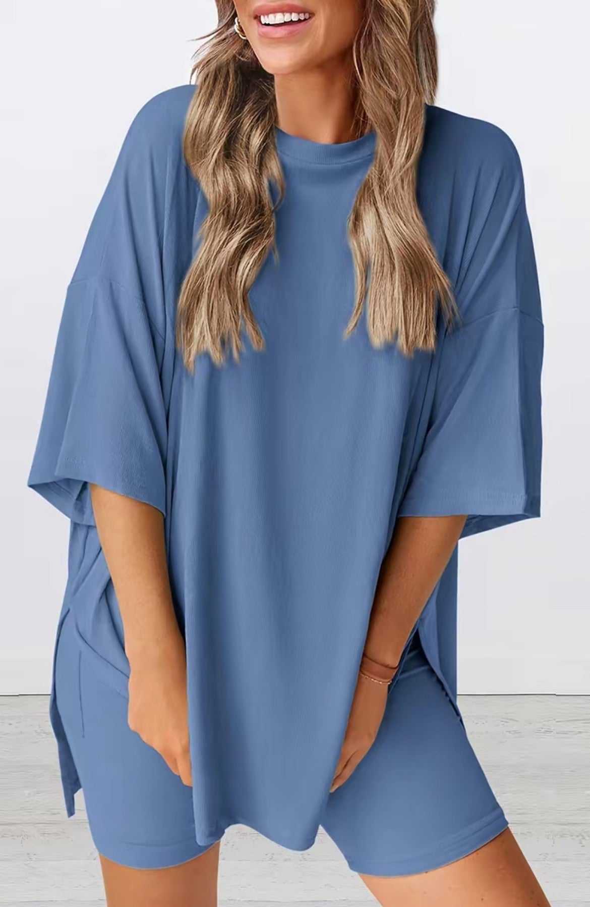 The oversized top and biker shorts combo give a laid-back yet trendy look—perfect for lounging, running errands, or even as a comfy maternity outfit!