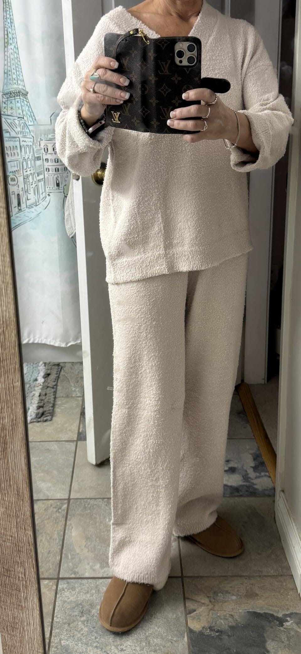 Made from premium fuzzy knit that’s softer, warmer, and stretchier than regular fleece. No stiff texture, no weight — just cloud-light warmth that stays breathable and comfy. Once you feel it, regular lounge sets will never feel the same.