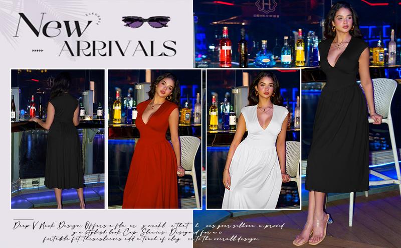 Women's Summer Casual Deep V Neck Cap Sleeve Swing A-Line Midi DressElevate your summer wardrobe with this stylish and versatile Women's Summer Casual Deep V Neck Cap Sleeve Swing A-Line Midi Dress. Perfect for warm weather, this dress combines comfort and a chic design, making it an essential addition to your collection.